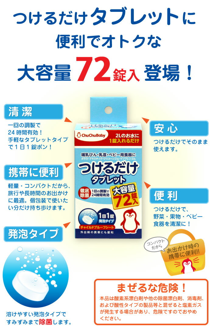 ≪用途≫乳首・哺乳びん(ガラス、プラスチック)の除菌剤≪成分≫ジクロロイソシアヌル酸ナトリウム(1錠中に500mg)、発砲剤(コハク酸、炭酸水素ナトリウム)、安定化剤(炭酸ナトリウム)≪使用料の目安≫水2Lに対し本品1錠を溶かして使用します。