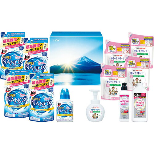 商品名 ライオン 富士山バラエティギフト(LFU-50) 商品内容 トップスーパーナノックス450g×1、同詰替用360g×4、キレイキレイ薬用泡ハンドソープ250ml×1、同詰替用200ml×4、チャーミーマジカ酵素プラス(フレッシュピンクベリー)220ml、同詰替用570ml×各1 ※キレイキレイ薬用泡ハンドソープ=医薬部外品 商品説明 新しい元号が始まる年!「あらためて襟を正して、おもてなし」 日頃、お世話になっている方へ感謝の気持ちをお届けします。