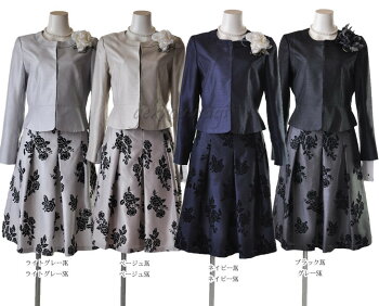 ライトグレージャケットとライトグレースカート、ベージュジャケットとベージュスカート、ネイビージャケットとネイビースカート、 ブラックジャケットとグレースカートの4パターンの中からお選びください。